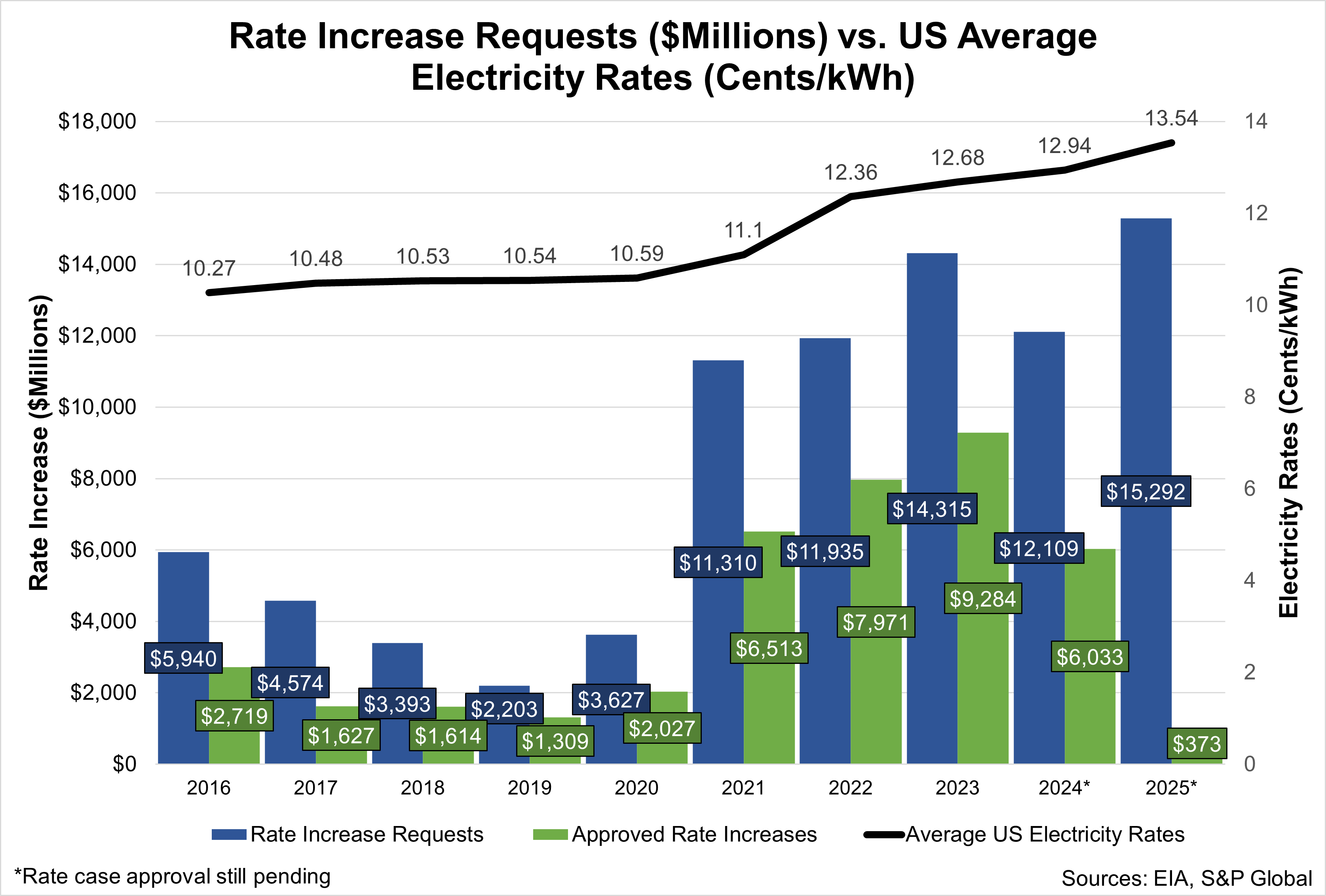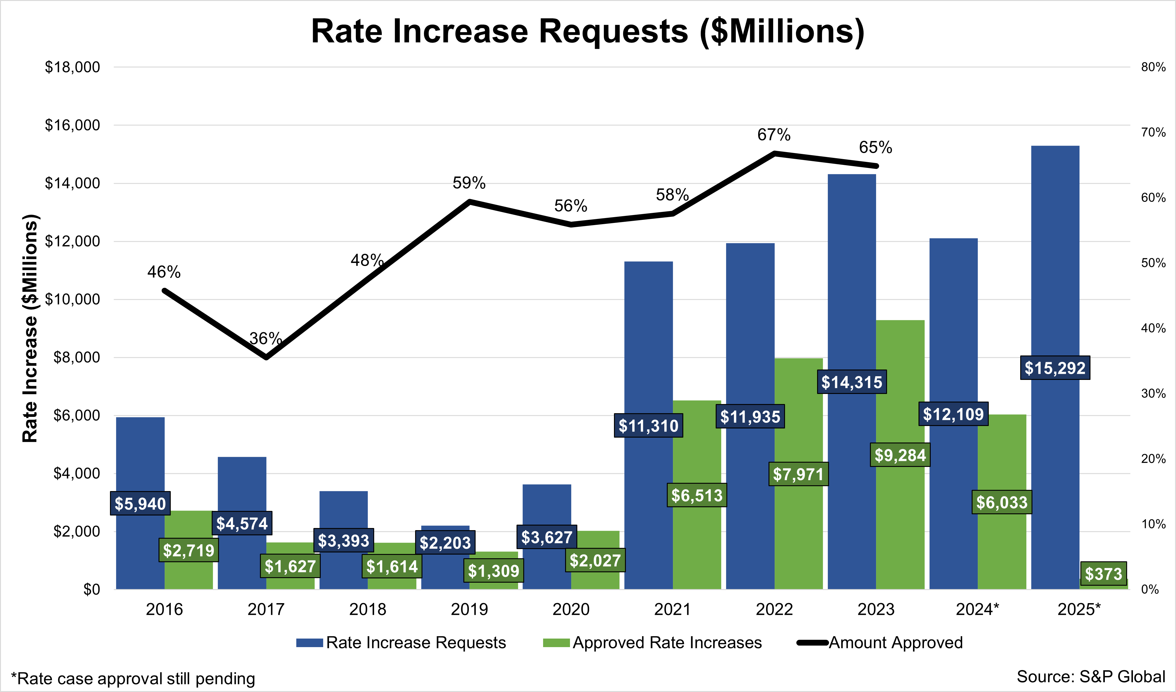 According to S&P Global, the largest rate increase requests filed in 2025 belong to the following:
