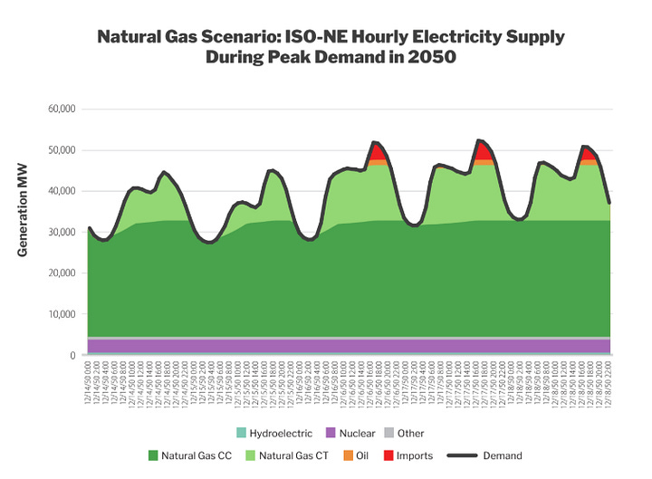 Natural Gas scenario: This scenario adds new natural gas plants and pipelines to meet rising demand, with gas accounting for 83 percent of generation in 2050 and existing nuclear accounting for 12 percent.
