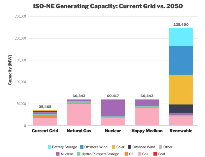 The Nuclear scenario would increase prices by 64.8 percent, the Natural Gas scenario by 13 percent, and the Happy Medium scenario by 26.5 percent. In comparison, prices in the Renewable scenario would increase by 126.4 percent, with massive impacts for New England families.