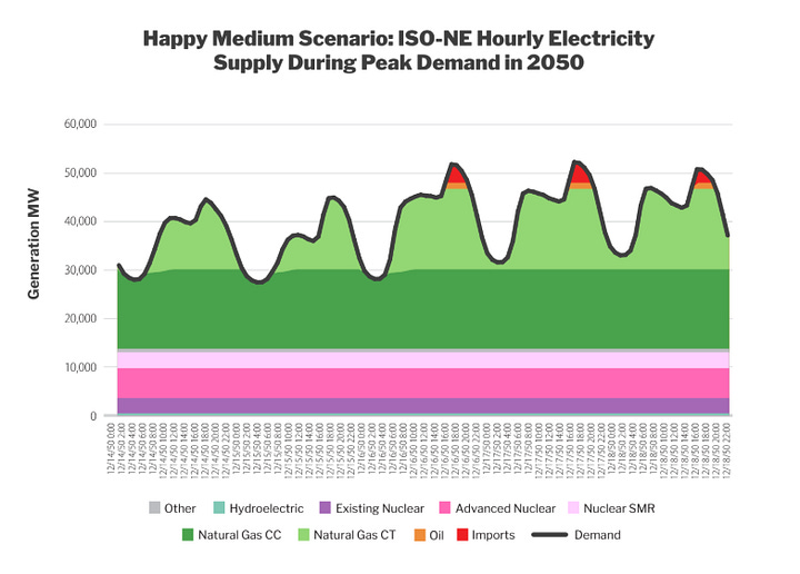 Happy Medium: This scenario adds nuclear and natural gas capacity, resulting in 47 percent nuclear, 47 percent natural gas, and 3 percent hydro and “other” in 2050.