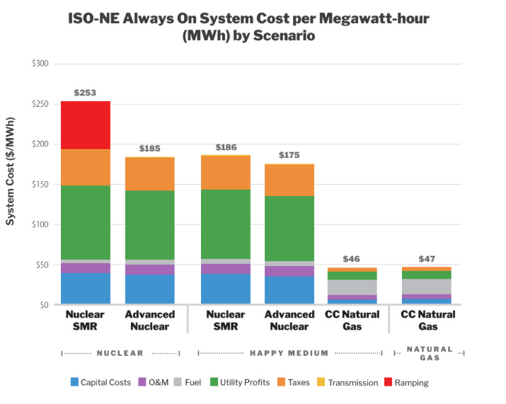 In comparison, the Natural Gas and Happy Medium scenarios use traditional natural gas peaking resources, thus saving billions of dollars, and there is no need to ramp the SMRs because they can run at full speed.