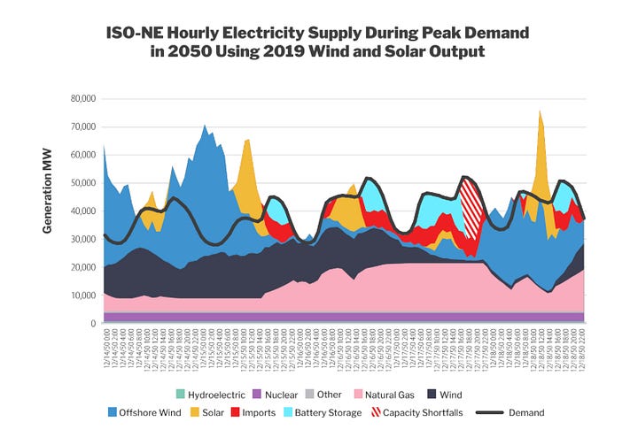 After stress-testing the ISO-New England across different weather years and wind and solar output, ISO-NE would experience a six-hour blackout in the Renewable scenario if the hourly wind and solar capacity factors matched those observed in 2019