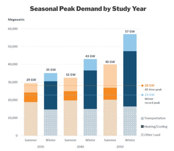 According to ISO-New England, electrifying home heating and transportation will increase the peak demand to around 57 gigawatts (GW), up from the all-time peak of 28 GW. Unlike the current peak, the forecast peak in 2050 will be in winter, not summer, due to the massive need for electricity for home heating.
