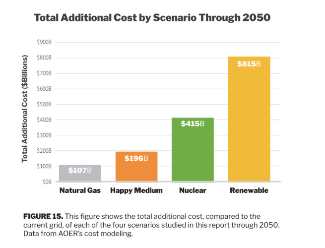 This means the Renewable scenario required 3.75 times more capacity than the scenarios that used nuclear and natural gas to meet growing demand.